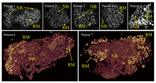 Micro-computed tomographic views of each case. Three-dimensional reconstructed images are provided for the samples from patients 6 and 7. NB indicates newly formed bone. RM indicates residual bone substitute material. In all specimens, the radio-opacity of residual bone substitute material is higher than that of newly formed bone.