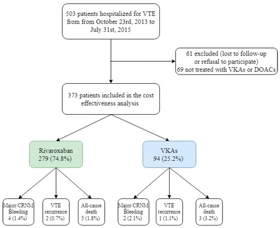 REMOTEV is an ongoing, prospective registry including all consecutive patients hospitalized in the Vascular Medicine Unit of Strasbourg University Hospital for acute deep vein thrombosis (DVT) and/or pulmonary embolism (PE) with a one year follow-up [21]. The present analysis focused on patients enrolled between 23 October 2013 (starting date of the registry) and 31 July 2015, aiming to evaluate the cost-effectiveness of two pharmacological strategies (DOACs, i.e., rivaroxaban, versus VKAs) after 6 months of follow-up. All patient data were gathered at the initial visit and via phone call at 6 months. Rivaroxaban was the only DOAC used in this study.