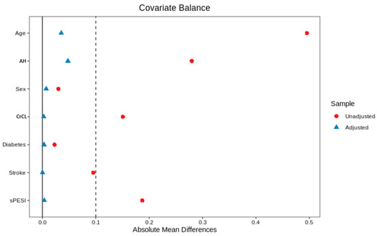 Standardized mean difference (SMD) before (red) and after (blue) inverse probability weighting from propensity scores. AH: arterial hypertension; CrCl: Cockcroft clearance of creatinine; sPESI: simplified Pulmonary Embolism Severity Index.
