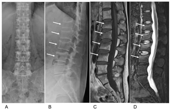 (A) Spinal and (B) lateral views of the patient’s lumbar spine show loss of vertebral height at L1–L4 (arrow). Sagittal lumbar MRI shows a low-intensity lesion at L1–L4 on T1-weighed imaging (C) and a high-intensity lesion on STIR imaging (D) (arrow).
