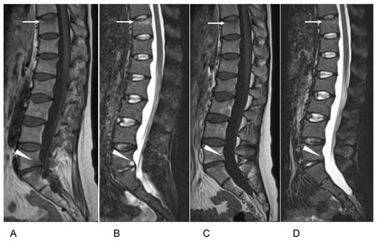 To exclude Cushing’s syndrome, the patient’s serum cortisol and adrenocorticotropic hormone were measured, and both were within the normal range. Her PⅠNP level had increased to 113 ng/mL, and TRACP-5b had decreased to 348 mU/dL (Table 1). Because (i) new vertebral fractures had occurred, (ii) the BMD values had not improved, and (iii) the patient reported feeling severe nausea after every teriparatide injection, the teriparatide treatment was discontinued. After a thorough explanation and discussion, treatment with romosozumab along with calcium and eldecalcitol was started. Two months after the start of the romosozumab treatment, the patient’s LBP was remarkably improved (NRS 0), and increases in the BMD values at the lumbar spine, femoral neck, and total hip were observed (Table 2). Additional MRI described the improvement of signal change on Th11 and L5 vertebrae (Figure 2C,D). After 12 months of the romosozumab treatment, compared to the baseline values, the BMD values had increased by 23.6% at the lumbar spine (L1–L4), 6.2% at the femoral neck, and 11.2% at the total hip.