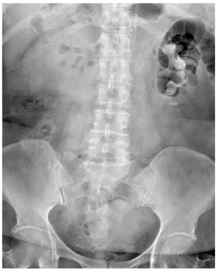 A follow-up KUB (Figure 5) was taken 2 months after the operation, and one residual stone about 24 mm in size and stone sands were found. The stone reduction rate was 76.7%. Laboratory data measured during the same clinic visit showed a decline in creatinine from 1.32 to 1.09 mg/dL. She is currently receiving regular follow-up for renal function, KUB, and renal echo every 6 months to 1 year, and she has not reported flank discomfort.