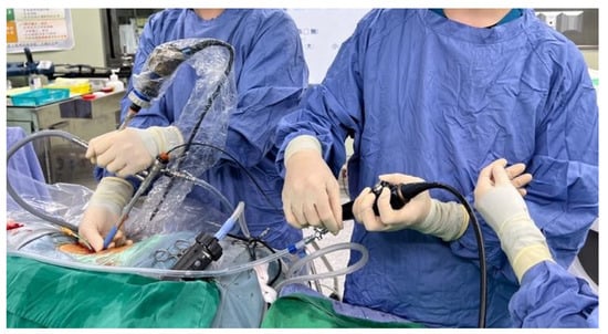 Operational assistance (left side) held the nephroscope, and the experienced endourologist (right side) performed flexible ureteroscopy.
