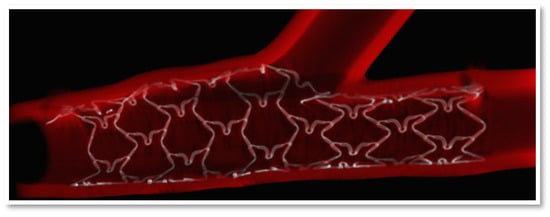 The device has 2 platinum radiopaque markers at both stent ends enabling precise deployment in tibial arteries. One the unique characteristics of Cre8 Des is the coating of the strut surface. It consists of a bio inducer surface (BIS), which is a 2nd generation ultra-thin pure carbon coating, less than 0.3 μm in size, that improves biocompatibility and hemocompatibility []. It is applied in the platform before drug loading. BIS is the only interface with endothelial layer and arterial blood flow promoting faster endothelization and healing as well as acting as an antithrombotic coating (Figure 2) []. It does not permit direct contact of the scaffold to the artery acting as a barrier to metal ions release, e.g., Nickel, when used on metal alloy avoiding allergic reaction. BIS does not affect the mechanical properties of the stent and it retains its continuity even after deformation.