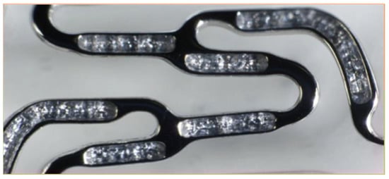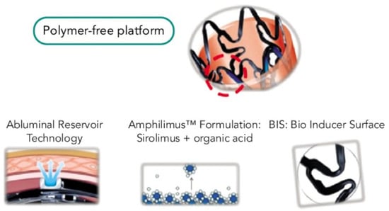 The release of the antiproliferative agent together with its polymer free carrier is succeeded through the abluminal reservoir technology (Figure 3). The drug is loaded onto the stent platform in reduced surface areas where it is protected, permitting retarded controlled elution to the arterial wall up to 90 days post-implantation [,].