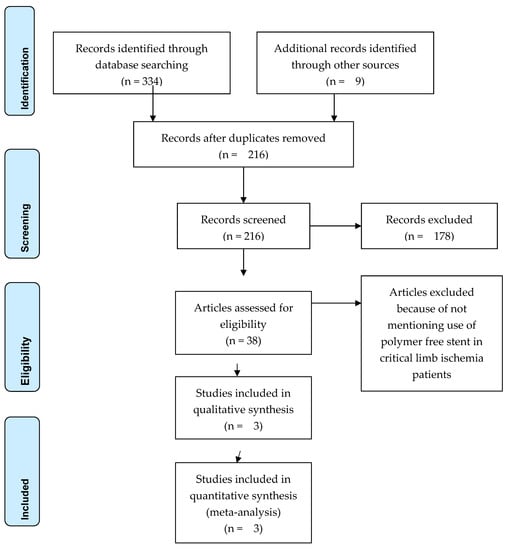 Initial search of electronic databases, organization websites and registers by using the key words identified 343 articles. After excluding duplicates and irrelevant records by reading the title and the abstract we retrieved 216 relevant articles. From these articles, 38 studies mentioned the use of non-polymer drug eluting stents. Further, 35 studies were rejected because did not mention the use of the stents in CLI patients. The remaining three studies were included in our review (Figure 4). The first study (S1) was retrieved from PubMed electronic database: Tigkiropoulos et al. in their prospective single-center cohort study present the use of Cre8 stent in 27 patients with infrapopliteal arterial disease comparing it with a control group of 27 patients subjected to angioplasty with paclitaxel-coated balloons []. The second study (S2) was retrieved from Google Scholar electronic database: Santos et al. in their prospective study present the use of Cre8 stent in 10 patients with infrapopliteal arterial disease []. The third study (S3) was retrieved from LINC2022 conference: Sirvent presents on his oral presentation the use of Cre8 in 42 patients with infrapopliteal arterial disease []. Kaplan–Meier curve diagrams provided in S3 were used to extract numerical data about primary and secondary patency, limb salvage, freedom from clinically driven target lesion revascularization (CD-TLR), and mortality at 12 and 24 months. Main outcomes analyzed in our present review were: Primary and secondary patency, major amputation rate, freedom from CD-TLR and mortality reported in three above mentioned studies. Any other additional information would be provided by contact with the corresponding authors.