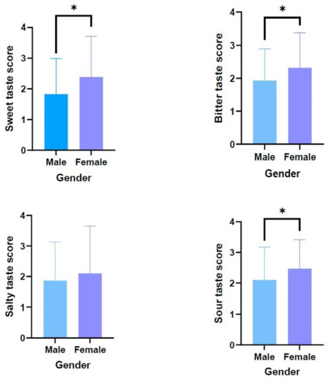 Differences in taste score by gender. The findings are presented as X ± SD. The use of a single asterisk (*) denotes the existence of statistically significant differences between the groups (p < 0.05).