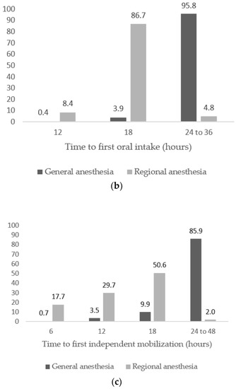 (a) Time to lactation establishment in hours according to anesthesia type; (b) time to first oral intake in hours according to anesthesia type; (c) time to first independent mobilization in hours according to anesthesia type.