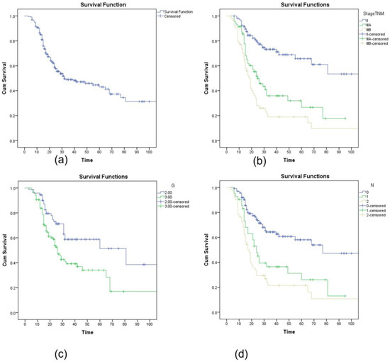 Kaplan–Meier curve assessing the disease-free survival (a) for the entire group, (b) according to TNM staging, (c) according to grading G, and (d) according to N status.