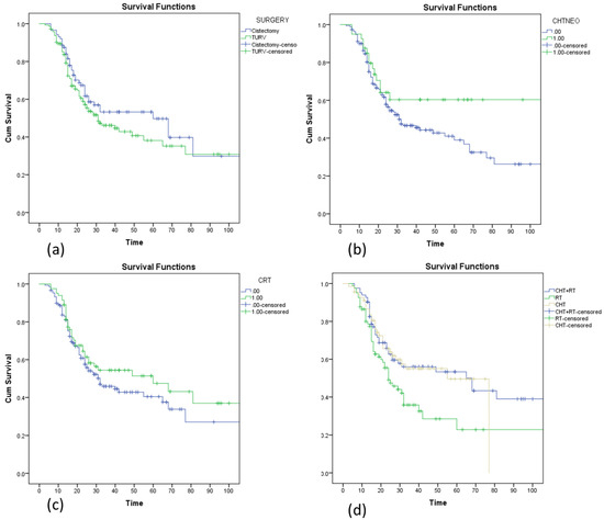 Kaplan–Meier curve assessing the disease-free survival (a) in patients who underwent surgery vs. TURBT, (b) in patients who underwent definitive chemoradiotherapy (CHT-RT) vs. neoadjuvant chemotherapy (CHT) vs. just radiotherapy (RT), (c) in patients who received definitive chemoradiotherapy, and (d) in patients who received neoadjuvant chemotherapy (CHTNEO).