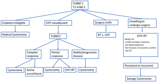 Proposed algorithm for treatment of T2–4 N0–1 M0 transitional BC (bladder cancer). TURBT = transurethral resection of bladder tumor; CHT = chemotherapy; RT = radiotherapy.