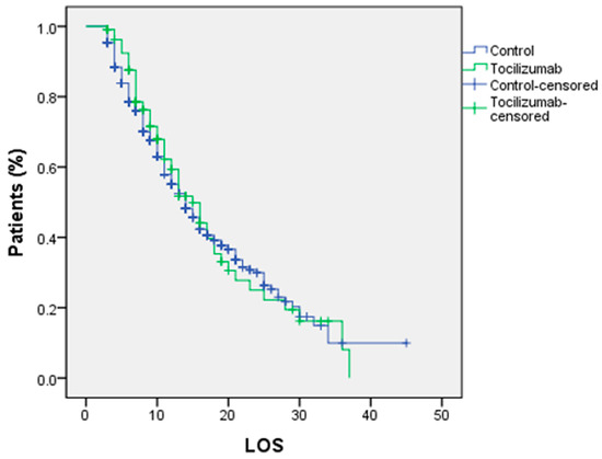 The primary outcome (death rate) shows a higher rate in the TCZ group without any statistically significant difference with the control group (p = 0.297), while the secondary outcome (length of hospital stay) shows a significant difference in favor of the control group (p = 0.045) as shown in Table 5. Furthermore, a comparison of LOS between the two groups using a Kaplan–Meier curve and a log rank test shows no statistically significant difference (p = 0.6690), as shown in Figure 1. Regarding the correlation between patients who required respiratory support and who were either discharged alive or died, it was shown that invasive and noninvasive ventilation had a greater death rate than other respiratory support systems, as indicated in Table 6.