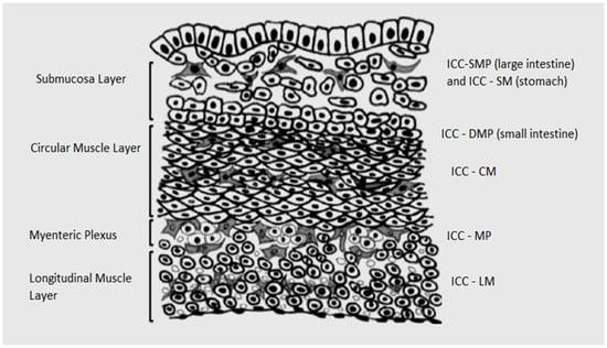 The ICC include a vast array of specialized cell types within the musculature of the gastrointestinal system. A number of these cell types play a pacemaker role within the gastrointestinal musculature, while others are heavily involved in the modulation of enteric neurotransmission. The most important cell types with a role in intestinal tract motility are the ICC of the myenteric plexus (MP), ICC intramuscular (IM) and ICC of the deep muscle plexus (DMP) (Table 1) [].