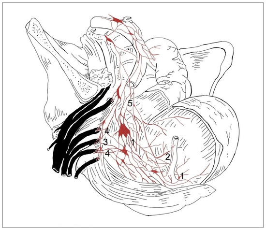 Uterovaginal plexus, front view, craniocaudal direction. Asymmetric formation of the uterovaginal plexus (5), uterus (2), vagina (3), small ganglia on the anterior and lateral sides of the vagina (4), bladder (1).