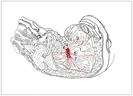 In the concentric type, 1 to 2 large-sized ganglia (2) are observed, from which arise separated branches (almost unconnected nerves on the periphery) to the outer surface of the vagina (1), to the urinary bladder (3), ureter (4), vagina (5), uterus (6), and rectum (7).