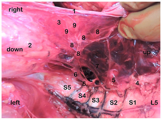 After retroperitoneal clarification of the pelvic splanchnic nerves entering the pelvic plexus from the anterior, lateral, and laterocaudal approach, we dissected the pelvic plexus and nerve structures innervating the bladder, prostate, seminal vesicles, and rectum. In women, we dissected the uterus and vagina. By pressing on the lower pole of the scrotum, we pushed the testis and epididymis upwards and visualized the plexus spermaticus and plexus deferentialis. The fascial structures covering the sacral nerve roots were excised. The parasympathetic nerve roots were identified using the distance from the anterior nerve roots S2–S4 and dissected along their course forward to their exit at the lateral border of the rectum. In all cadavers, we clarified the lumbosacral plexuses after evisceration. In the lumbosacral region, the roots were defined based on their participation in the formation of the plexuses. To show the intimate relationship of both systems, we also focused on the details of the structure (rami communicantes) related to the connections of the ANS with the spinal nervous system. Histological techniques (hematoxylin and eosin) were used to reliably identify ganglia obtained during dissections to determine whether the identified tissue structures contained neurons.