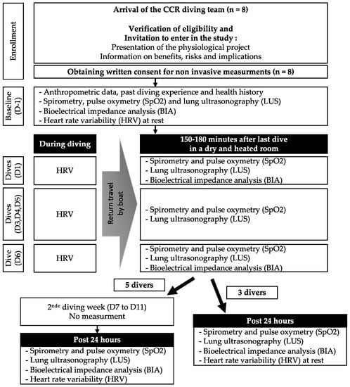 Divers were monitored prior to the first dive, after the dive during the first five diving days, and 24 h after their last dive (i.e., after five diving days for three divers and ten days for five divers) in a dry and heated room (temperature 18–20 °C). The study flowchart is shown in Figure 1.
