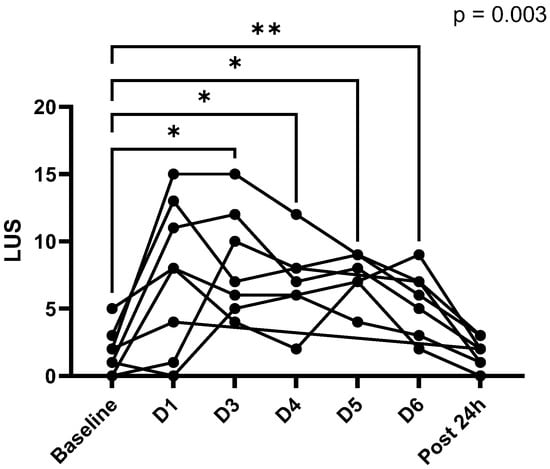 Evolution of individual lung ultrasound score (LUS) throughout repetition of day dives. All divers developed B-lines after several dive days and a return to baseline 24 h after the last one. p-value for the ANOVA. Tukey’s multiple comparisons test is expressed versus baseline with * p < 0.05, ** p < 0.01.