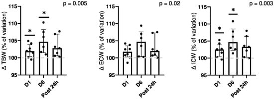 Evolution of hydration status measured by impedancemetry. Results are expressed in percentage of baseline variation. TBW, total body water; ECW, extra-cellular water; ICW, intra-cellular water. The p-value for the ANOVA. Tukey’s multiple comparisons test is expressed versus baseline with * p < 0.05.