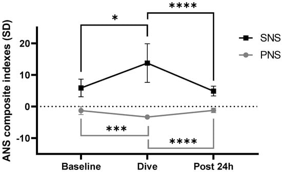 Autonomic nervous system (ANS) composite index measured by HRV. HRV parameters were performed at rest, in sitting position at baseline and 24 h after last day dive. Dive measurements were recorded in immersion during the diving program (n = 23). PNS, in parasympathetic nervous system; SNS, sympathetic nervous system; SD, standard deviation of measurement to the normal population average. Dunn’s multiple comparisons test is expressed versus dive with * p < 0.05, *** p < 0.001 and **** p < 0.0001.