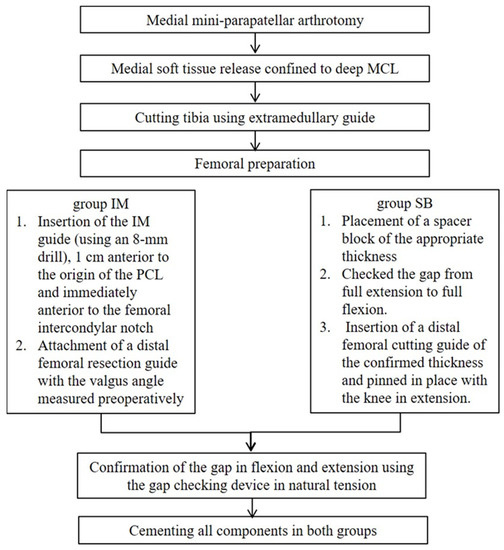 Schematic diagram of surgical procedure in UKA. MCL; medial collateral ligament, IM; intramedullary, SB; space block.