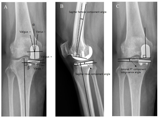 Measurement of alignments of the femoral and tibial components on postoperative radiographs. (A) Coronal femoral component angle (α) and coronal tibial component angle (β). (B) Sagittal femoral component angle and sagittal tibial component angle. (C) Coronal FT component congruence angle.