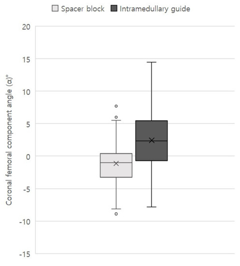 However, several radiological parameters differed significantly between the groups. Although the extent of correction of the mechanical FT angle did not differ between the groups, the postoperative mechanical FT varus angle was smaller in group SB than in group IM (−1.8° ± 3.7° vs. −0.3° ± 3.2°, p = 0.025), which was similar to the preoperative difference. The coronal femoral component angle (α) was valgus 2.4° ± 4.9° in group IM, and varus 1.1° ± 3.2° in group SB, respectively (p < 0.001) (Figure 3).
