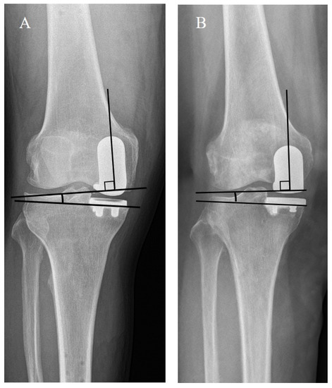 Standardized anteroposterior and lateral radiographs of the knee, whole lower extremity standing anteroposterior (AP) radiographs were obtained for radiologic assessment. All radiological parameters were measured twice at a 2-week interval using a Picture Archiving and Communication System by two orthopedic surgeons who were not members of the surgical team. The preoperative mechanical FT varus angle, MPTA, and posterior tibial slope angle were measured. Postoperatively, the mechanical FT varus angle, coronal femoral component (α) angle and coronal tibial component (β) were determined by measuring varus (−)/valgus (+) alignment of each component relative to the long axis of the tibia on AP radiograph [11,20]. Sagittal femoral component angle was determined as the angle between a line perpendicular to the component part placed on distal femur cut and a long axis of the femur [21]. Sagittal tibial component angle was determined as the angle between a line perpendicular to the long axis of the tibia and a line tangential to the tibial component on a lateral radiograph (Figure 2). The coronal FT component congruence angle was defined as the angle of tilt between the line perpendicular to the long axis of the femoral component surface and the clearly visible lower margin of the tibial component in the AP view; lateral convergences between these two lines were assigned positive values. Clinical and radiological results achieved at 2 years postoperatively were used for comparison between the groups.