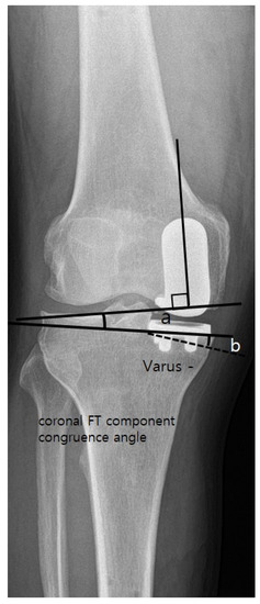 Figure that expresses the imaginary lines showing the coronal FT component congruence angle increases as the varus degree of coronal tibial component angle increases. The (a) indicates the coronal FT component congruence, and the (b) indicates the the varus degree of coronal tibial component angle.