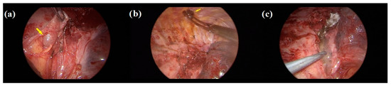 Thoracoscopic pitch images of the surgery, after complete hemangioma excision: (a) removal of the posterior thoracic gland (arrow) and duct clipping; (b) parietal pleurodesis with an iodopovidone-soaked sponge (arrow); (c) the residual surgical field is sealed with absorbable hemostatics.