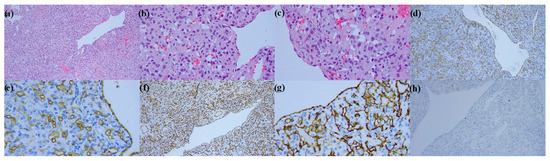 Pathology images: (a–c) hematoxylin and eosin stain: capillary hemangioma consists of small thin-walled vessels proliferation with lobular and solid growth patterns, dilated vessels, and more solid endothelial proliferation. Fibrosis, bland interstitial inflammation, and smooth muscle proliferation can be detected; (d,e) cytoplasmic immunoreactivity for CD31 in blood vessels and endothelial cells; (f,g) cytoplasmic immunoreactivity for CD34 in vessels layers and solid endothelial proliferation; (h) scattered nuclear positivity for ki67 in endothelial cells, very low proliferation rate is observed.