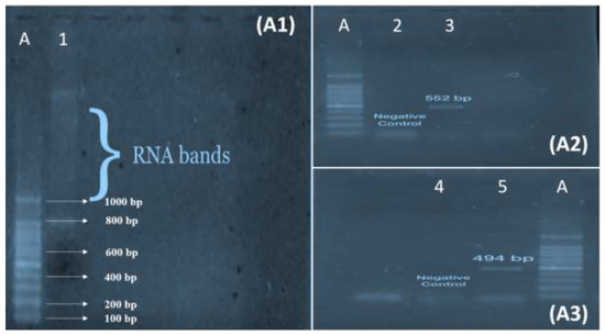 Agarose Gel Electrophoresis separates fragments of DNA based on size and charge by using the MultiSub Mini Horizontal Electrophoresis System. Two grams of agarose powder were dissolved in 100 mL of 1× tris boric acid EDTA (TBE) buffer to make agarose gel. After that, the beaker was heated on a hot plate for 1 min. For the visualization of DNA bands, 5 µL of ethidium bromide was mixed once it had cooled. Finally, the gel was poured into the caster containing combs and left for 20 min to settle. After solidification, combs were removed, and the caster was settled in the gel tank. DNA 5 µL was loaded into a well by mixing with 5 μL of loading dye. The electric current was applied for 50 min at 80 V and 300 Amp of current. After running, the gel was then observed with a gel documentation system (MicroDoc, Cleaver Scientific, Rugby, UK). Fragments of GP41 were seen at 494 bp and 552 bp using a 100 bp DNA ladder.