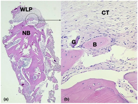 (a) Histologic image (25×) of a biopsy sample harvested with a trephine at the time of removal of the titanium barrier. The lower portion shows the newly formed lamellar bone (NB), while the upper portion shows the white layer of pseudo-periosteum (WLP). (b) Higher magnification image (100×) showing connective tissue (CT) with the presence of densely packed collagen fibers with few cells and a scarcity of blood vessels. No inflammatory reactions or epithelial tissue are present. Newly formed bone (B) portions and residual graft fragments (G) are present. Images are of H&E staining and were acquired with a digital scanner.