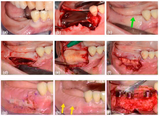(a) Initial situation, it is evident the bone atrophy of the jaw. (b) First surgical phase of vertical bone augmentation with particulate graft and occlusive titanium barrier (OTB), fixed with three self-tapping screws. (c) The picture shows the soft tissue situation six months later, before the barrier removal. The green arrow highlights the coronal shifting of the mucogingival junction as result of the passivation of the flaps. (d) The buccal full-thickness incision is placed in the alveolar mucosa for the barrier removal. (e) A white layer of dense connective tissue, called the pseudoperiosteum, is observed underneath the OTB, protecting the newly formed hard tissue. (f) The buccal alveolar mucosa is apically sutured leaving intentionally exposed a vestibular portion of white pseudoperiosteum. (g) The picture shows the healing after 1 week. (h) The situation three months after the “white layer approach” (WLA) shows the new position of the mucogingival line as highlighted by the yellow arrows. (i) Implant placement in mature bone. It’s evident the difference in maturation of the bone compared to the picture (e).
