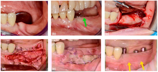 (a) Initial situation, it is evident the bone atrophy and the lack of keratinized tissue. (b) the picture shows the soft tissue situation 6 months after the vertical bone augmentation and before the barrier removal. The green arrow shows the coronal shifting of the mucogingival junction. (c) The picture shows the buccal incision placed in the alveolar mucosa and the barrier removal. (d) The buccal alveolar mucosa is apically sutured leaving intentionally exposed a vestibular portion of pseudoperiosteum. (e) The picture shows the healing after 1 week. (f) The situation after the “white layer approach” (WLA) and after the implant placement shows the new position of the mucogingival line as highlighted by the yellow arrows.