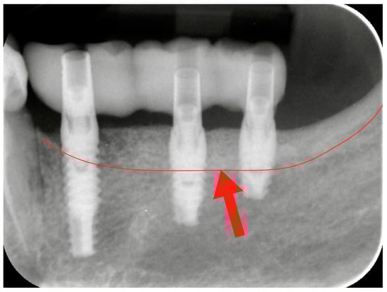 Radiographic check-up after the provisional resin restoration placement. The red line and the red arrow show the bone level before the vertical bone augmentation. The bone portion above the red line represents the amount of the vertical regeneration.