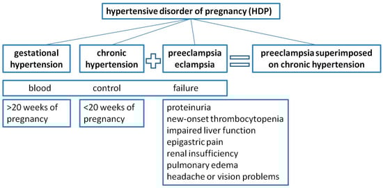 There are four distinct entities of hypertensive disorder of pregnancy (HDP) which are gathered under a common denominator, blood control failure (Figure 1). They include gestational hypertension, chronic hypertension, preeclampsia/eclampsia, and preeclampsia superimposed on chronic hypertension [,]. Gestational hypertension is diagnosed after 20 weeks of pregnancy as systolic and diastolic blood pressure values higher than 140 mmHg and 90 mmHg, respectively, in two separate measurements, taken four or more hours apart [,]. Chronic hypertension is diagnosed before the 20th week of gestation, and when complicated with preeclampsia, it leads to another, separate HDP entity—preeclampsia superimposed on chronic hypertension []. Diagnosis of preeclampsia is most commonly made in the presence of hypertension and proteinuria (at least 300 mg of proteins in 24 h urine collection). Additionally, in the absence of proteinuria, diagnosis can be established if a patient presents with new-onset thrombocytopenia, impaired liver function and/or epigastric pain or right upper quadrant pain, renal insufficiency, pulmonary edema, headache, or vision problems [].