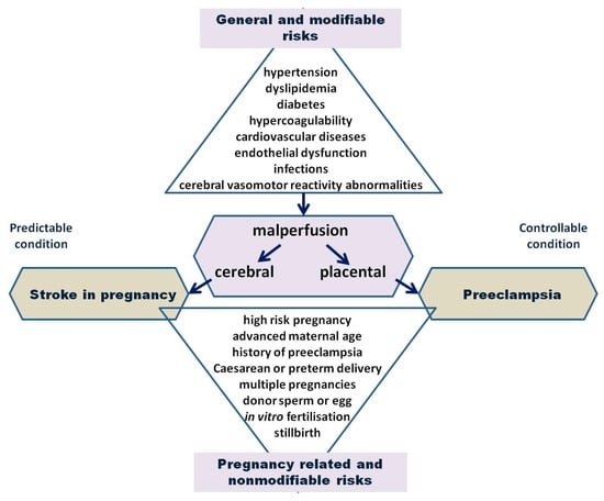 Stroke during pregnancy and preeclampsia are two distinct but interrelated medical conditions that pose significant risks to maternal and fetal health. Both conditions can lead to adverse outcomes and have been the focus of extensive research efforts. Stroke in pregnancy, although relatively rare, represents a critical medical emergency with potentially devastating consequences for both the mother and the unborn child. On the other hand, preeclampsia, characterized by hypertension and organ dysfunction, remains one of the leading causes of maternal morbidity and mortality worldwide. While both conditions share some similarities in terms of their impact on maternal well-being, they also exhibit some distinct clinical manifestations [,,].