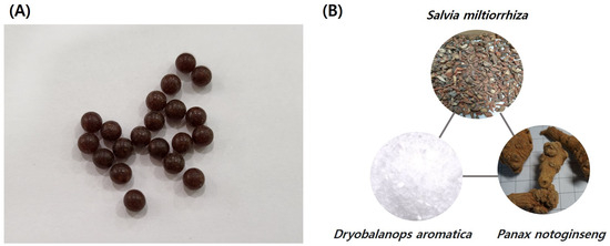 Compounded Danshen Dripping Pills (CDDPs). (A) CDDPs are a brown colored, round pill, usually 4.5 mm (0.18 inch) in size. (B) The three main herbal components of CDDP are Salvia miltiorrhiza, Dryobalanops aromatica, and Panax notoginseng.