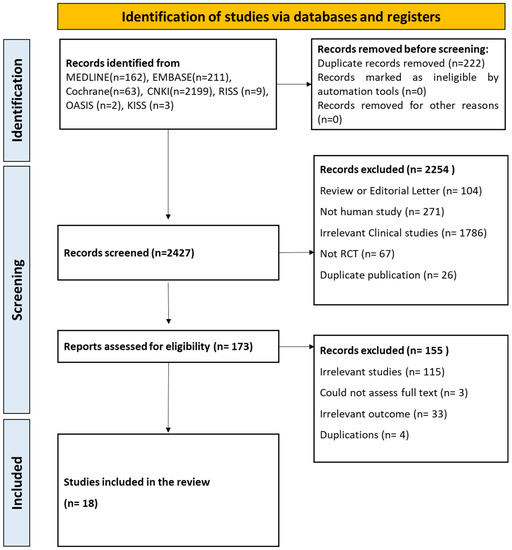 The following seven databases were searched from their inception to September 2022: MEDLINE (PubMed, https://pubmed.ncbi.nlm.nih.gov/ accessed on 30 September 2022), Cochrane Library (CENTRAL, https://www.cochranelibrary.com/), EMBASE (https://www.embase.com), OASIS (https://oasis.kiom.re.kr/), Korea Citation Index (KCI; https://www.kci.go.kr), and China National Knowledge Infrastructure (CNKI; https://oversea.cnki.net/index/), Research Information Sharing Service (RISS; http://www.riss.kr/index.do). The search strategies are shown in Supplementary S1.