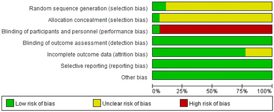 To assess the risk of bias in our meta-analysis, we evaluated the included studies based on key criteria, including random sequence generation, allocation concealment, blinding of participants, blinding of outcome assessment, incomplete outcome data, and selective reporting. Our assessment revealed that 2/18 studies had a low risk of bias for random sequence generation [53,66]. The high number of unclear risk studies was due to the lack of clear information provided regarding the methods used for randomization. For allocation concealment, only one study clearly reported the method used and was assessed as having a low risk of bias [64]. With regards to the blinding of participants, only one study was assessed as having a low risk of bias, while the rest were assessed as having a high risk [60]. This was because the intervention and control groups received different interventions, making it impossible to blind the participants. Blinding of the outcome assessment was evaluated as having a low risk of bias for all studies included in our analysis. As the outcome of interest was a blood test, it was impossible for the participants or researchers to influence the outcome. In incomplete outcome data assessment, we found four studies had an unclear risk of bias for incomplete outcome data [51,54,64,68]. Finally, selective reporting was assessed as having a low risk of bias for all studies included in our analysis. This was because the number of participants in the intervention and control groups was reported before and after the intervention, ensuring that there was no selective reporting (Figure 3 and Figure 4).