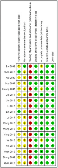 Risk of bias summary for the 18 studies analyzed. Green ‘+’ circles = Low risk of Bias; yellow ‘?’ circles = uncertainties about the risk of bias; red ‘–’ circles = high risk of bias. Reference: Bai 2008 [64]; Chen 2018 [53]; Gu 2020 [65]; Guo 2007 [60]; Huang 2005 [68]; Jia 2017 [63]; Jin 2015 [54]; Li 2015 [56]; Lin 2017 [66]; Lu 2017 [55]; Wang 2015 [58]; Wang 2016 [57]; Yang 2019 [62]; Ye 2016 [51]; Yin 2017 [67]; Yuan 2013 [61]; Zhang 2009 [59]; Zhao 2016 [52].