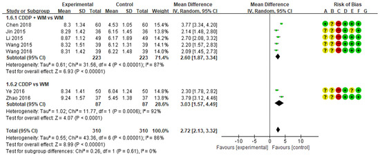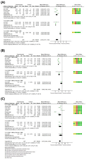 When the results of 10 studies measuring plasma viscosity (PV) were compared, the PV was lower in the treatment group than in the control group (MD −0.37, 95% CI −0.54 to −0.19) (Figure 5C) [59,60,61,62,63,64,65,66,67,68]. In subgroup analysis, six studies showed PV was significantly lower in the CDDP + WM treatment group than in the WM control group (MD −0.39, 95% CI −0.69 to −0.10) [59,61,62,63,64,68]. In the three studies using CDDP vs. WM, PV was significantly lower in the treatment group than in the control group (MD −0.34, 95% CI −0.61 to −0.08) [65,66,67]. In the one study using CDDP + WM vs. Placebo CDDP + WM, PV was significantly lower in the treatment group than in the control group (MD −0.22, 95% CI −0.57 to 0.13) [60].
