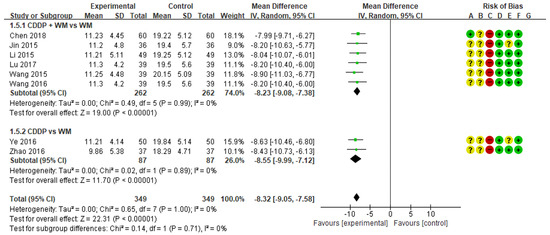 A meta-analysis of the eight studies measuring homocysteine showed lower homocysteine levels in the treatment group than in the control group (MD −8.32, 95% CI −9.05 to −7.58) (Figure 6) [51,52,53,54,55,56,57,58]. In subgroup analysis, homocysteine was significantly lower in the CDDP + WM treatment group than in the WM control group (n = 6, MD −8.23, 95% CI −9.08 to −7.38) [53,54,55,56,57,58]. Similarly, homocysteine was significantly lower in the CDDP treatment group than in the WM control group (n = 2, MD −8.55, 95% CI −9.99 to −7.12) [51,52]. No studies in the CDDP + WM vs. Placebo CDDP + WM subgroup reported homocysteine levels.