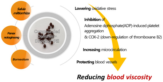 In East Asia, various herbal medicines and acupuncture are being used to treat diabetes and its associated complications [21,22]. Among these herbal prescriptions, the Compounded Danshen Dripping Pill (CDDP; also known as the cardiotonic pill) is a drug used for coronary vascular disease management in China and has been reported to be effective in lowering blood sugar and treating diabetic complications, including blood viscosity (Figure 1). In particular, CDDP has been shown to suppress oxidative stress and inflammatory responses in animal experiments [23,24]. Clinical studies have also reported that CDDP is effective in reducing triglyceride or low-density lipoprotein cholesterol (LDL-C) levels and slowing the progression of diabetic retinopathy when used in combination with aspirin in a coronary disease case [25,26]. However, there is no comprehensive review on the effect of CDDP on blood oxidative stress in diabetic patients, and there is no study on the effect of CDDP on blood viscosity and related hemorheological indices. Therefore, this study aimed to analyze the effectiveness and safety of CDDP in T2DM via a systematic review to summarize the evidence and suggest implications for further study and clinical practice.