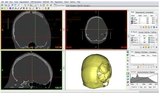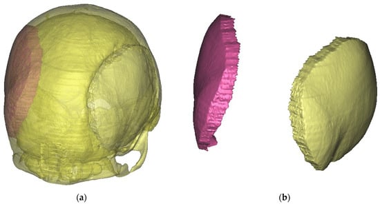 The resulting CT scan files were exported in the Digital Imaging and Communications in Medicine (DICOM) format. Subsequently, the DICOM data were imported into MIMICS software (version 10.01, Materialise’s Interactive Medical Image Control System, Materialise NV, Leuven, Belgium), a specialized tool for interacting with DICOM files. In this study, MIMICS was utilized for image visualization and segmentation, enabling the creation of three-dimensional (3D) renderings of the relevant anatomical structures (Figure 1). By employing cutting and mirroring techniques on the model derived from the unaffected side of the skull, a 3D representation of the missing part of the skull was constructed, effectively closing the defect on the opposite side (Figure 2a,b). The digital 3D model of the absent cranial portion was then exported in STL (Standard Triangle Language) format, suitable for 3D printing purposes (Figure 3a,b).