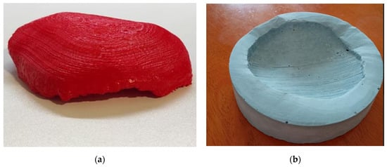 A PLA prototype matching the bone defect (a) and a negative prototype—a mold used for intraoperative adaptation of the implant (b).