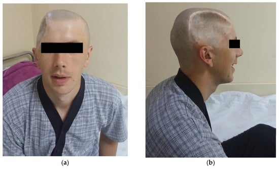 In the first case, a 24-year-old male patient sustained a traumatic brain injury (TBI) following a fall from a height of 4–5 m. One year before the CP surgery, the patient underwent surgery for epidural empyema at the same medical facility, but pathogen isolation was not achieved. The cranial defect involved the frontal, parietal, and temporal bones. The time interval between the injury and CP was 12 months, and the surgical procedure lasted 140 min (Table 1). Additionally, Figure 4a depicts the defect in the frontal aspect, while Figure 4b shows the defect in the lateral aspect.