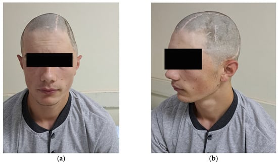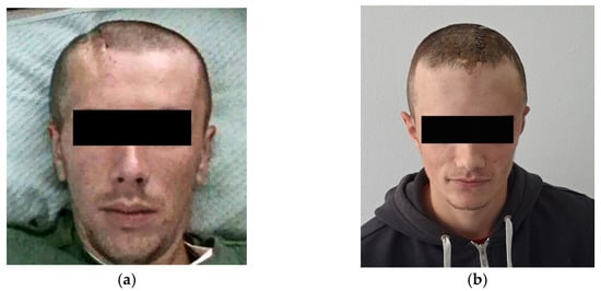 After the surgical procedure, in all three cases, both functional and aesthetic effects were achieved. In Figure 10a, Case 1 can be seen after the removal of the stapler pins, showing evident aesthetic improvement. In Figure 10b, Case 2 can be observed with aesthetic and functional progress after the cranionoplastic neurosurgical procedure.