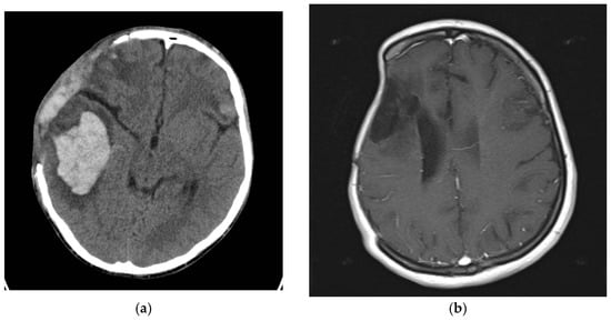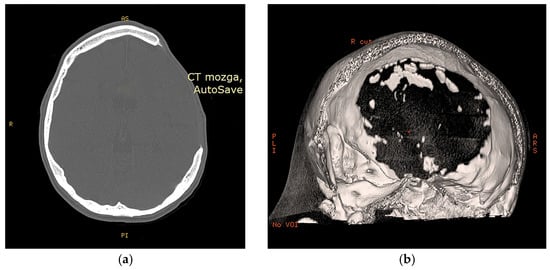 In Figure 6a, a defect affecting the frontal, temporal, and parietal bones of the skull vault can be observed in case 2. Based on the CT scan, a 3D reconstruction was made, which is shown in Figure 6b for better visualization and surgical planning. In the case of Case 1, intracerebral bleeding is visible as a result of TBI, as well as the state after DC (Figure 7a). As can be seen in Figure 7b, Case 3 has an ischemic zone in the right frontal and parietal lobes due to MCA occlusion, as well as a large bone defect.